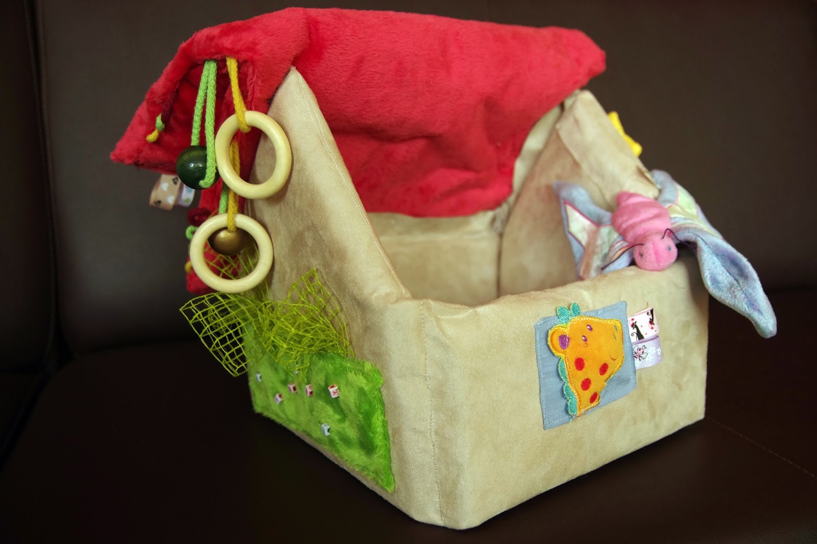 Szyjąc domek zadbałam nie tylko o różne kolory, ale również o różne faktury tak, żeby nasza wnuczka mogła doświadczać różnych wrażeń sensorycznych. Dzięki otwieranemu dachowi można zaglądnoć do środka domku, który  z czasem  zapełniony różnymi dodatkami. Jakimi? Zobaczymy.